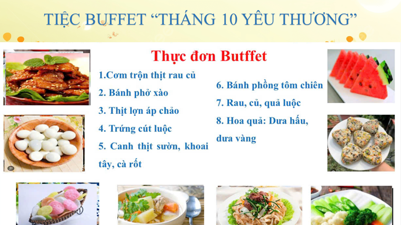 Bữa tiệc được tổ chức tại các lớp, được trang trí sinh động, nhiều màu sắc, âm nhạc vui tươi tạo không khí náo nhiệt. Thực đơn buffet phong phú, đa dạng, gồm nhiều món ăn quen thuộc, phù hợp với lứa tuổi như: Thịt lợn áp chảo, cơm trộn rau củ, bánh phở xào, trứng cút luộc, rau củ luộc, trái cây,… được trình bày bắt mắt, hấp dẫn.