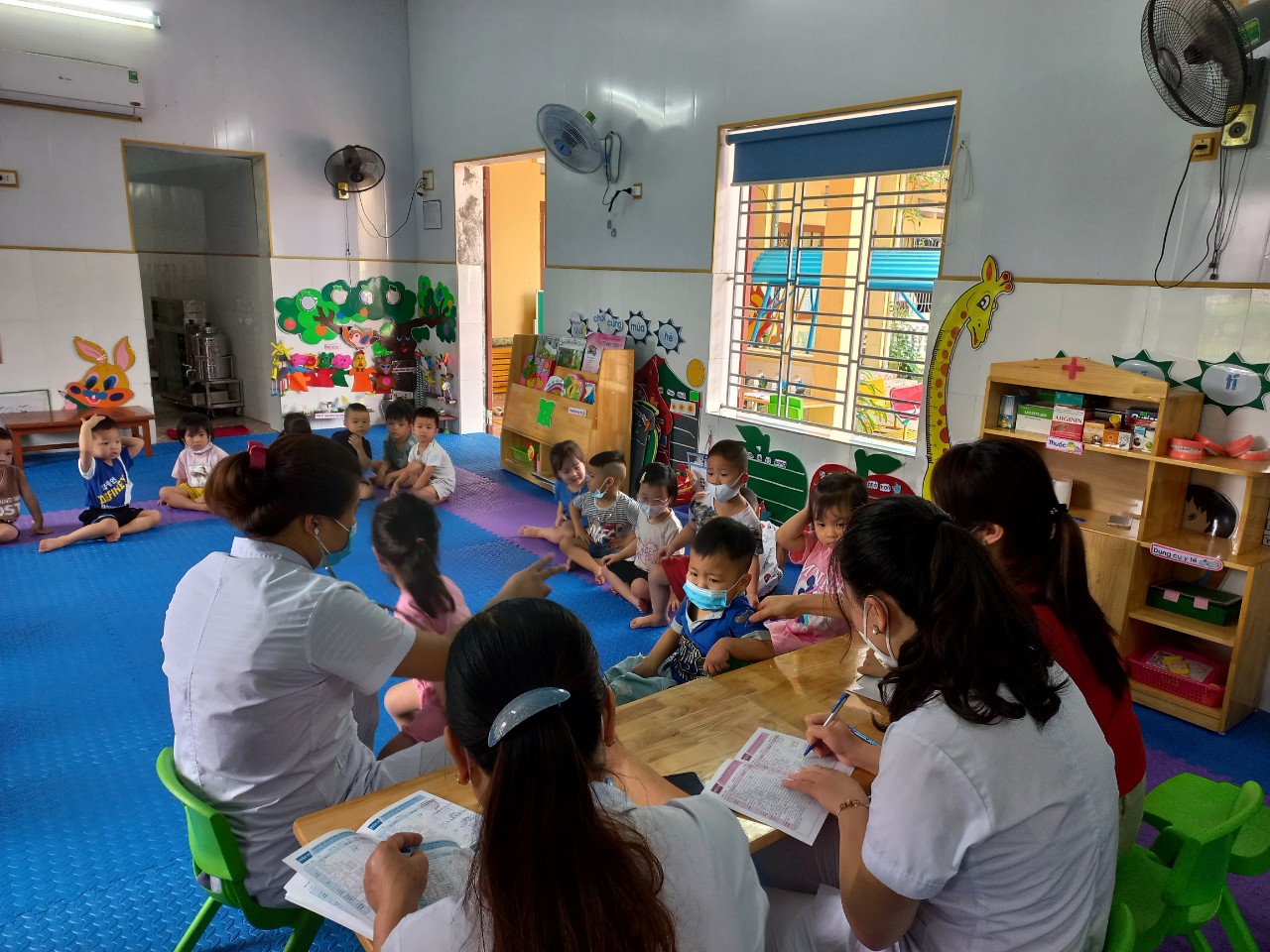 Hôm nay ngày 13/4/2022, Trường mầm non Lê Thiện phố hợp với Trạm Y tế tổ chức khám sức khỏe định kì cho 100% trẻ trong nhà trường, cùng giáo viên phụ trách các lớp ghi chép cụ thể trong sổ theo dõi sức khỏe, phân loại sức khỏe trẻ và được giáo viên các lớp thông báo tới phụ huynh, đặc biệt là một số trẻ mắc bệnh về răng miệng, qua đó phụ huynh cùng phối hợp có biện pháp điều trị kịp thời cho trẻ.