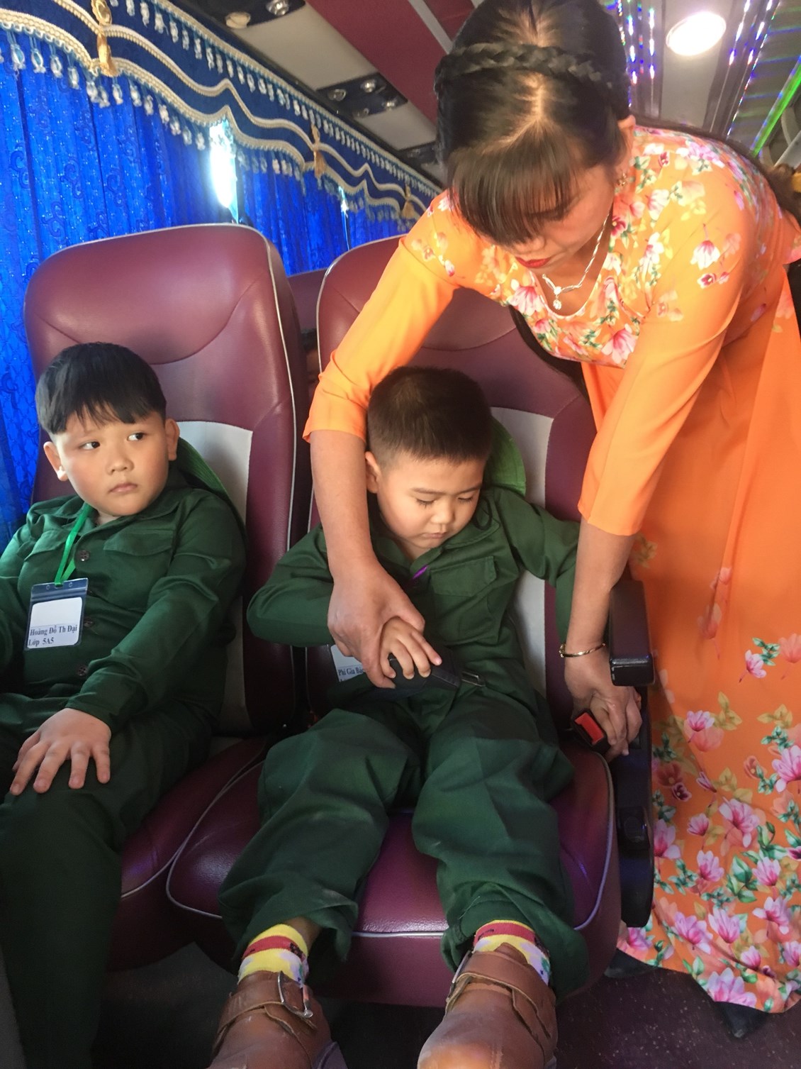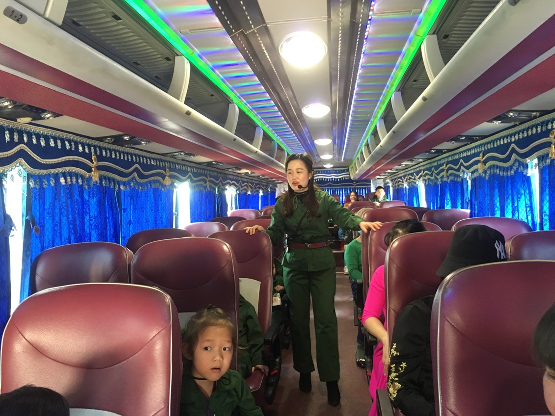 Trên xe các bé được hướng dẫn các hành vi khi tham gia giao thông ( ngồi trên ô tô) bé thắt dây an toàn, ngồi ngay ngắn không thò đầu, thò tay ra ngoài cửa sổ, không nô nghịch, không xả rác ra xe và không tự ý ra khỏi chỗ ngồi khi xe đang di chuyển.