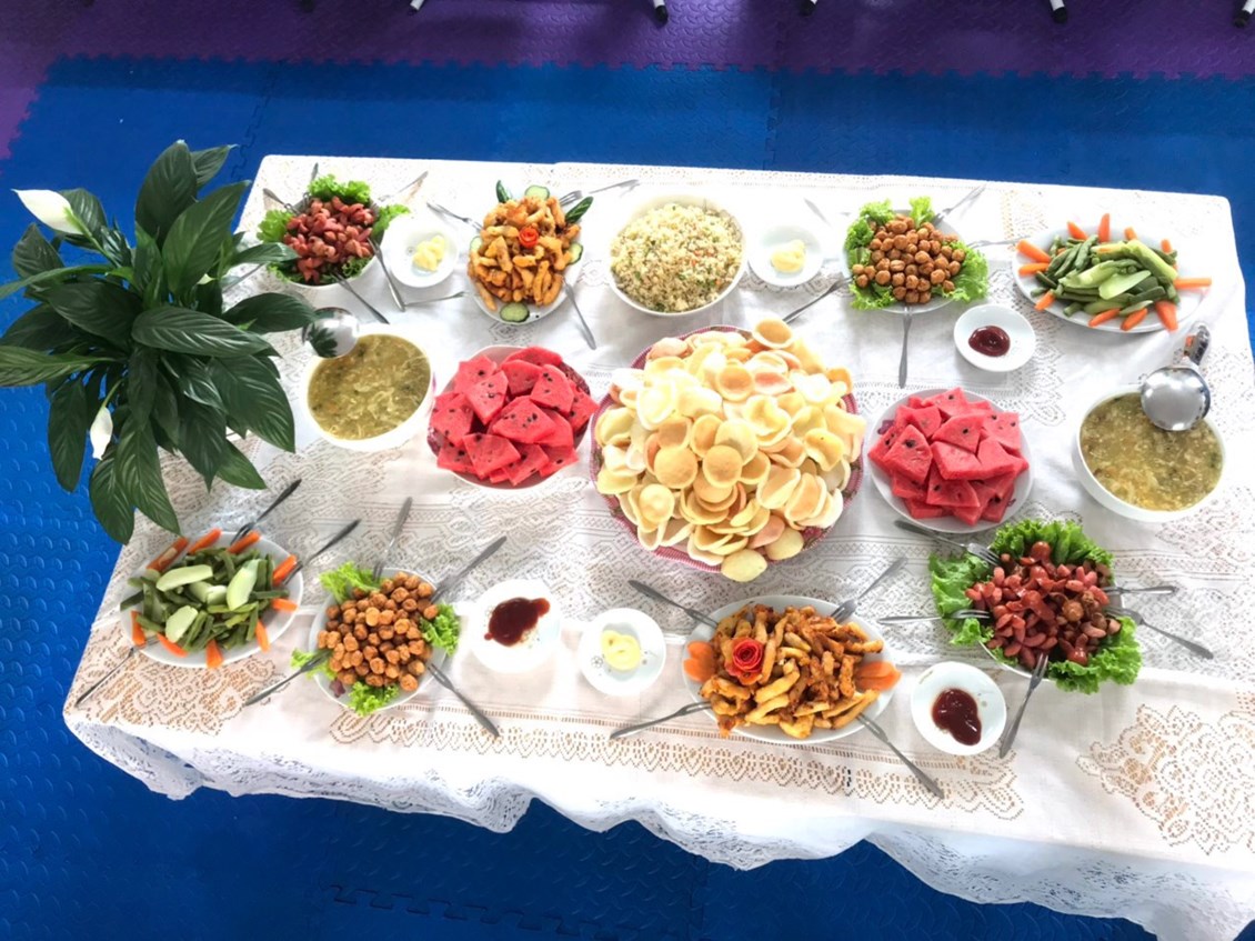 Ngày 27/4, tại trường mầm non Lê Thiện, các bé được tham gia bữa tiệc Buffet thật là vui vẻ và ý nghĩa. Đây là dịp để các con có thể thưởng thức một bữa ăn giàu dinh dưỡng. Có thể nói thực đơn của trẻ mầm non trong tiệc buffet chính là menu được cân nhắc và tính toán kỹ càng về chế độ dinh dưỡng, tỷ lệ các chất, khẩu vị, phối hợp món. Chính vì vậy đây cũng là cơ hội mà các bé được thưởng thức bữa ăn khoa học, phong phú các món ăn hơn bao giờ hết; Và đây cũng là cơ hội trải nghiệm hình thức ăn uống hiện đại, là cơ hội để làm quen với kiểu ăn phương tây để các con có thể tự tin hơn, có được sự thoải mái hơn khi tham gia các bữa tiệc tương tự ở các không gian khác nhau. Là dịp để bé học hỏi, tìm hiểu về tiệc buffet; là cơ hội để bé học được phép lịch sự khi ăn uống, rèn tính tự lập, biết quan tâm người khác. Dưới đây là những hình ảnh về buổi tiệc buffet ở trường mầm non Lê Thiện: