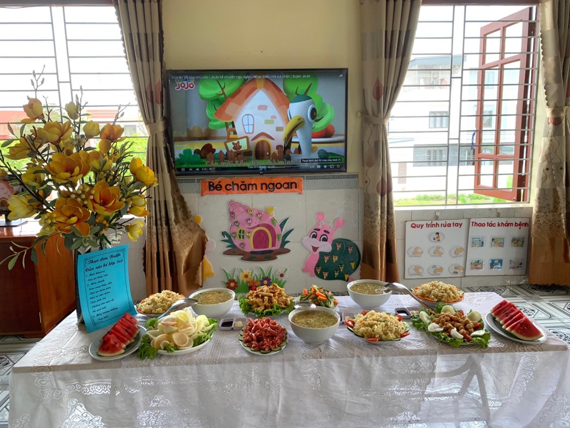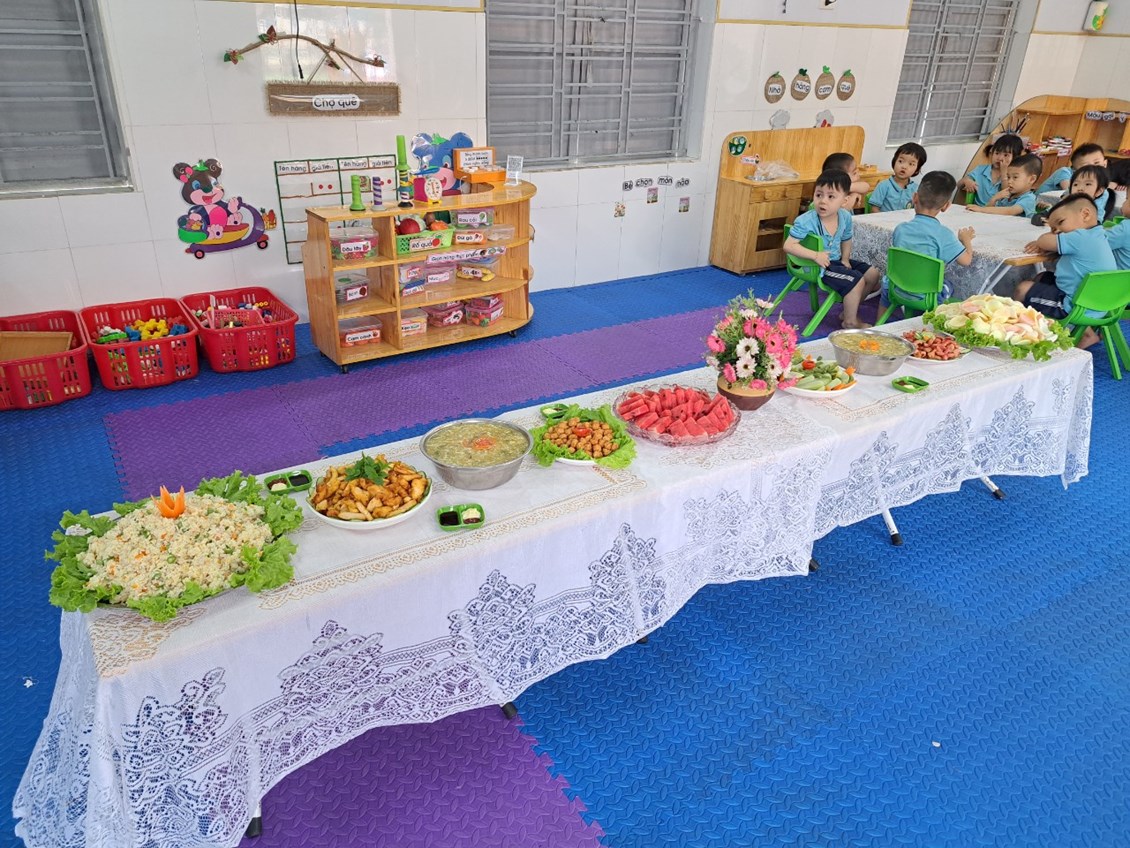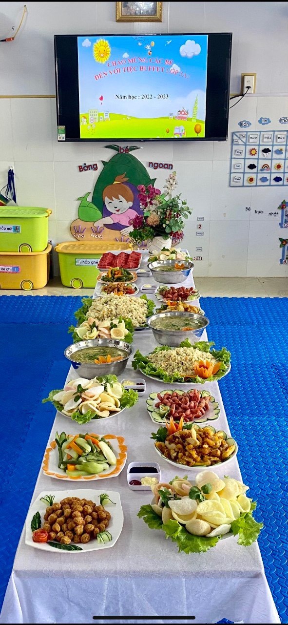 - Cô và trẻ cùng bày bàn tiệc thật là hấp dẫn. Cùng một thực đơn nhưng mỗi lớp đều có cách bày và trang trí khác nhau nhưng rất là hấp dẫn và bắt mắt. Dưới đây là bàn tiệc của các lớp: