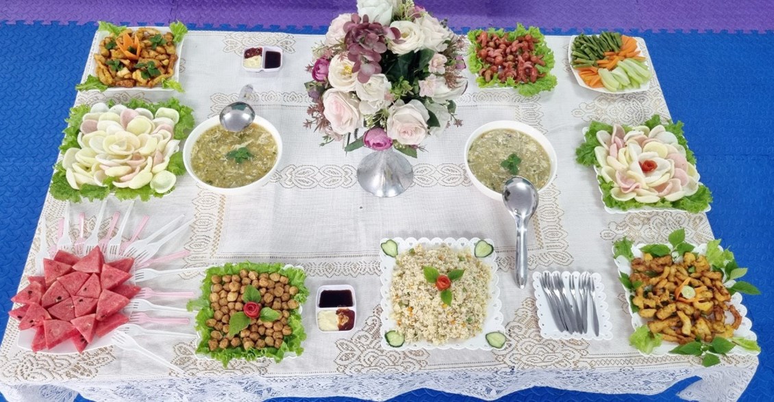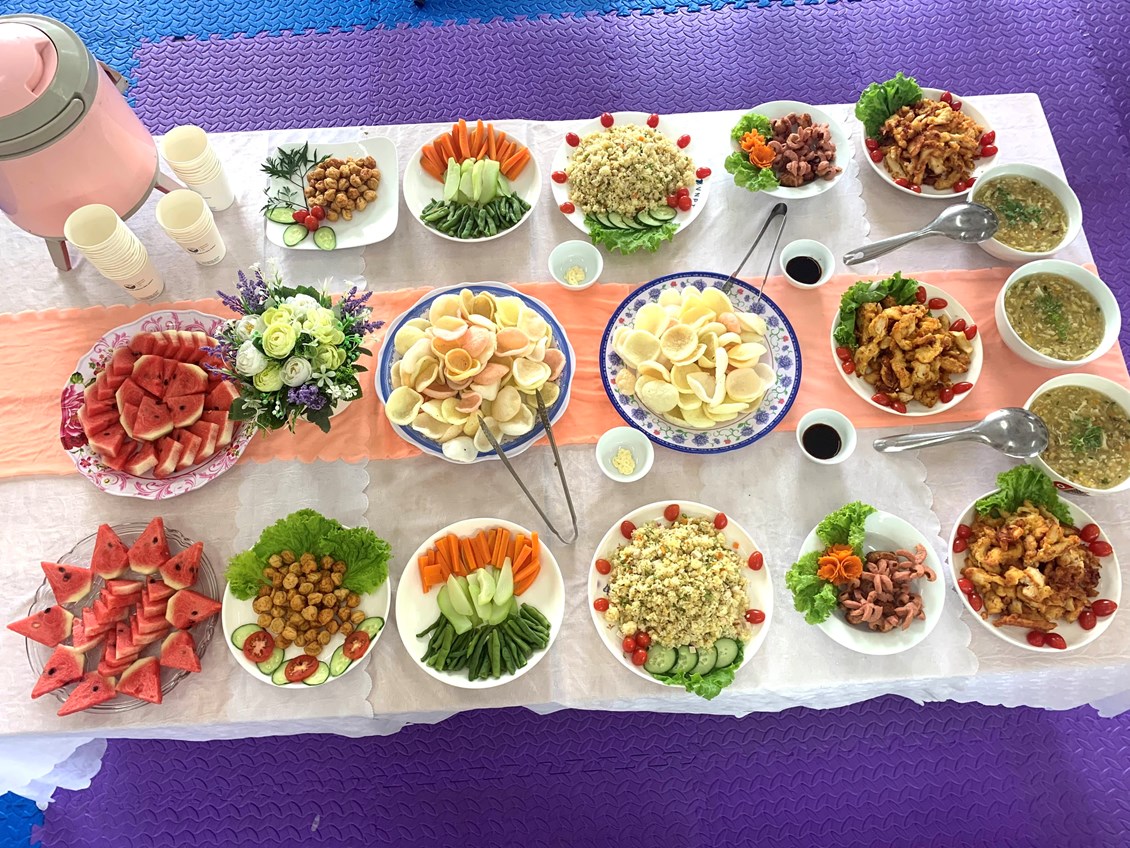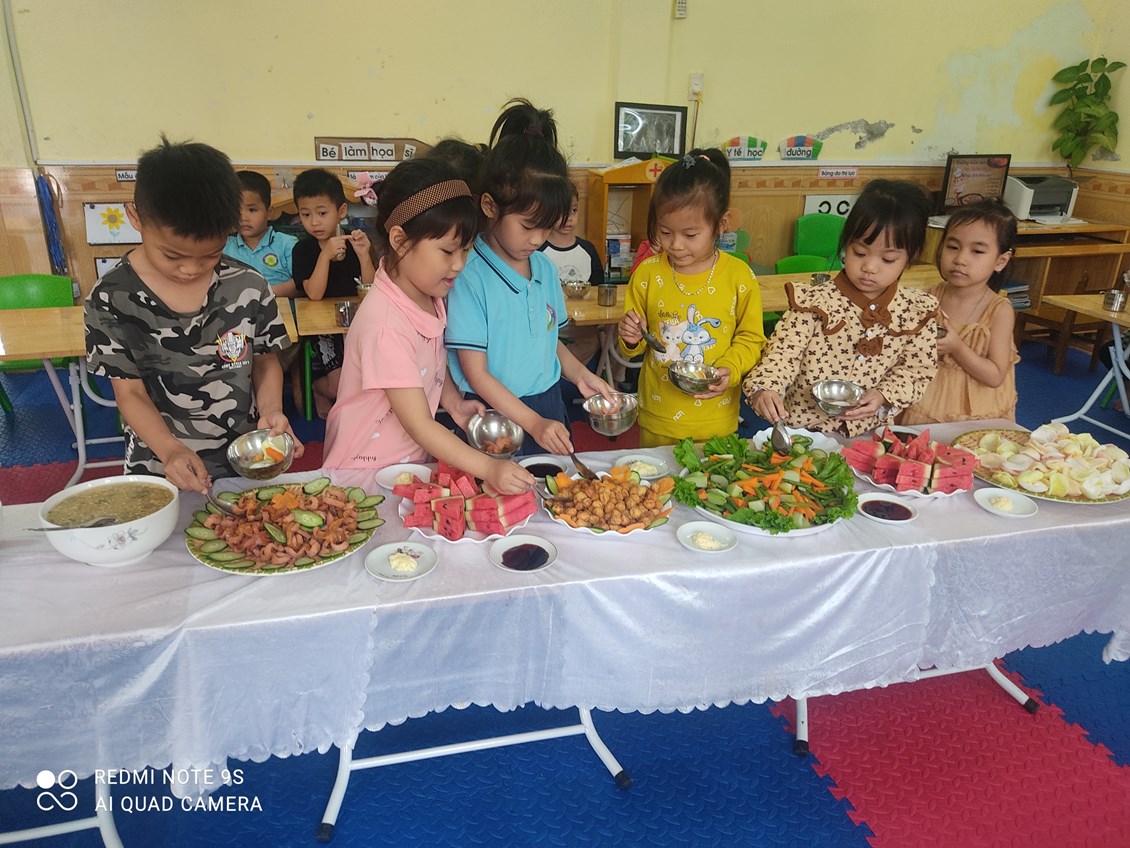 - Phụ huynh tích cực tham gia cùng cô giáo để chuẩn bị bữa tiệc buffet cho trẻ
