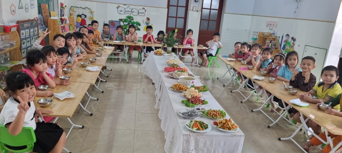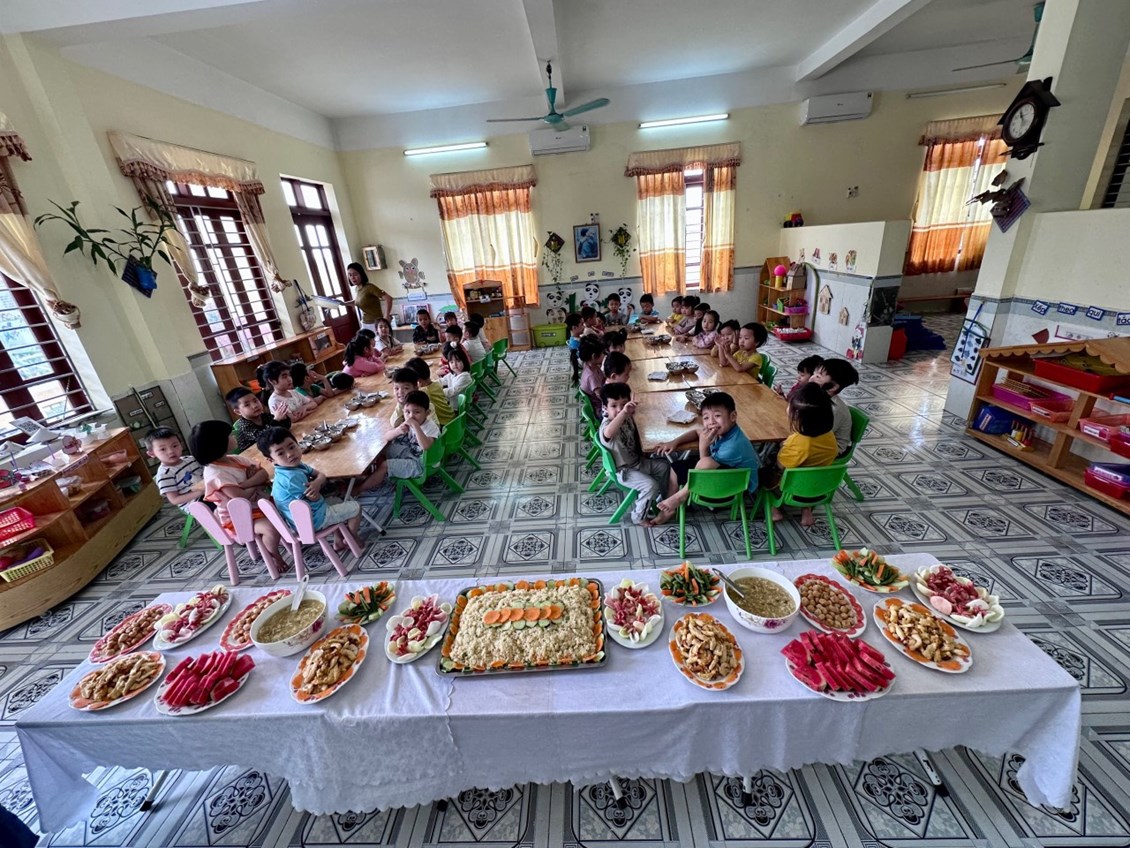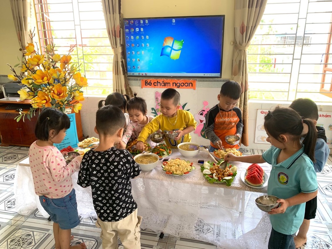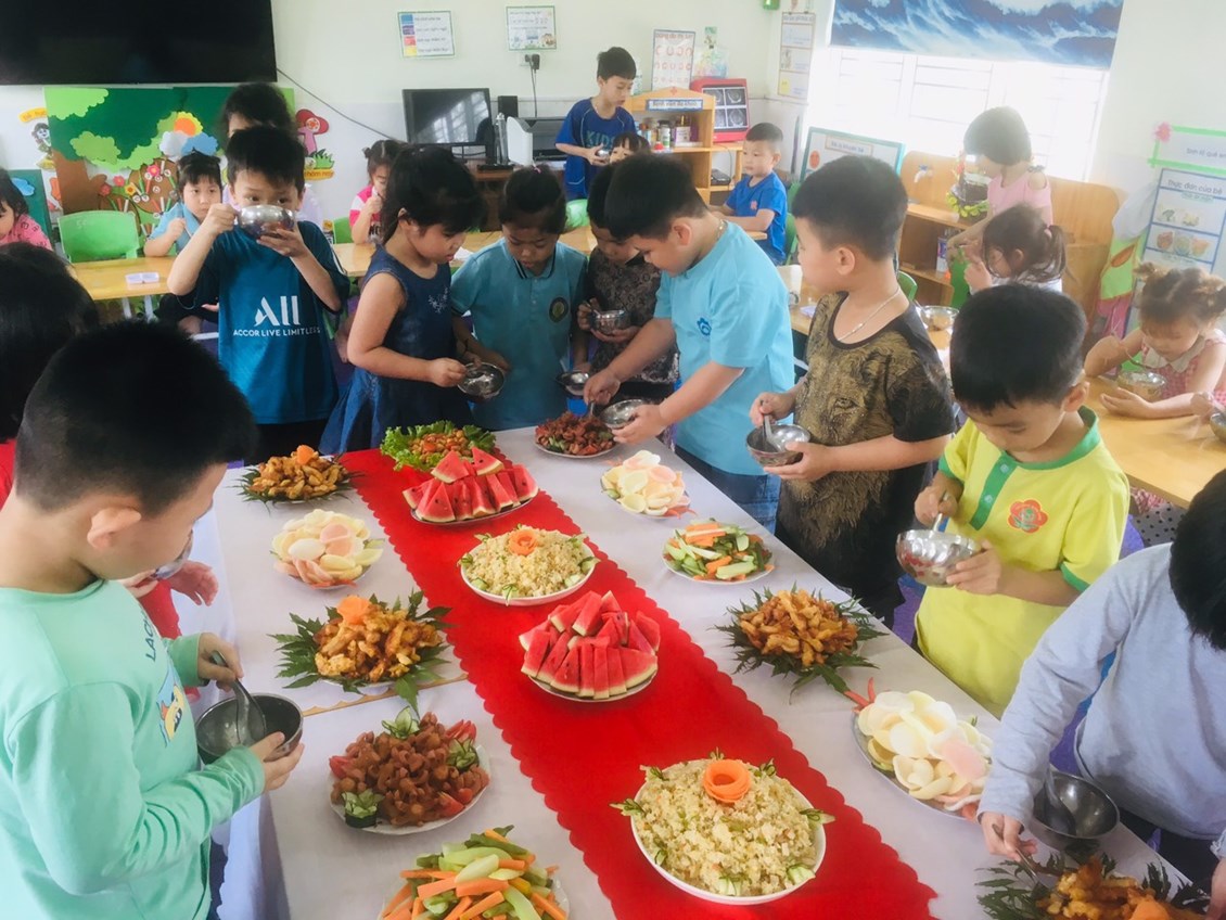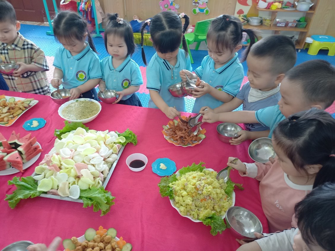 Trong bữa tiệc các bé sẽ được thưởng thức món ăn, được tìm hiểu về các món ăn và cách lấy thức ăn trên bàn tiệc. Từ các bé nhà trẻ đến các bé lớp mẫu giáo, các con rất hứng thú và chủ động đi lấy thức ăn cho mình 1 cách khéo léo và lịch sự.