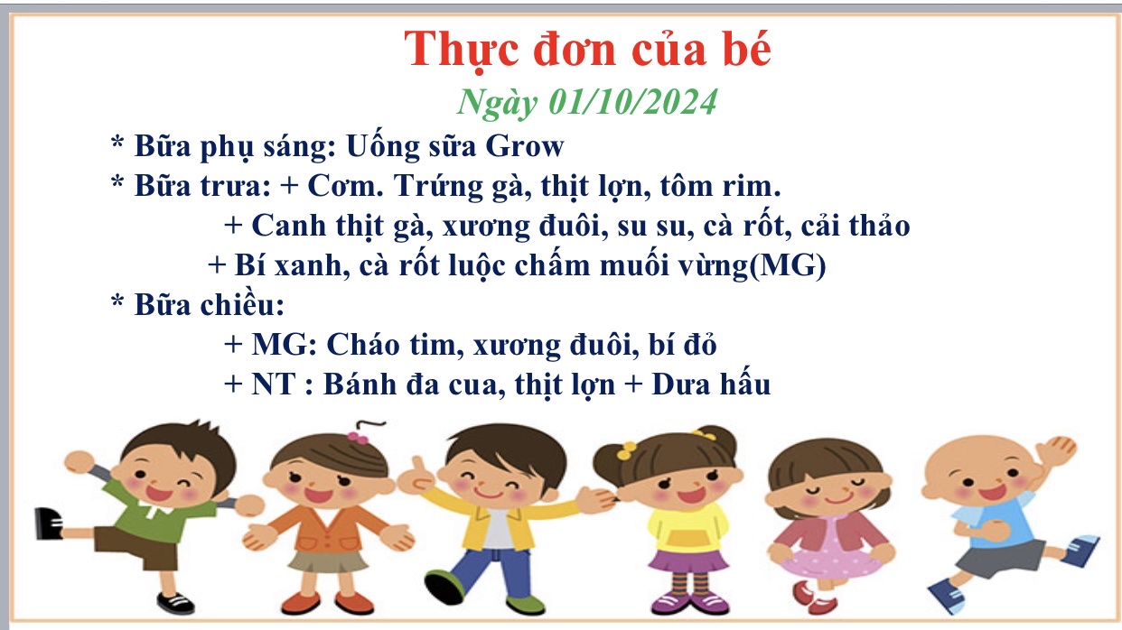 Hôm nay, trường mầm non Lê Thiện xin gửi tới các bậc phụ huynh Thực đơn của các con ngày hôm nay như sau:
