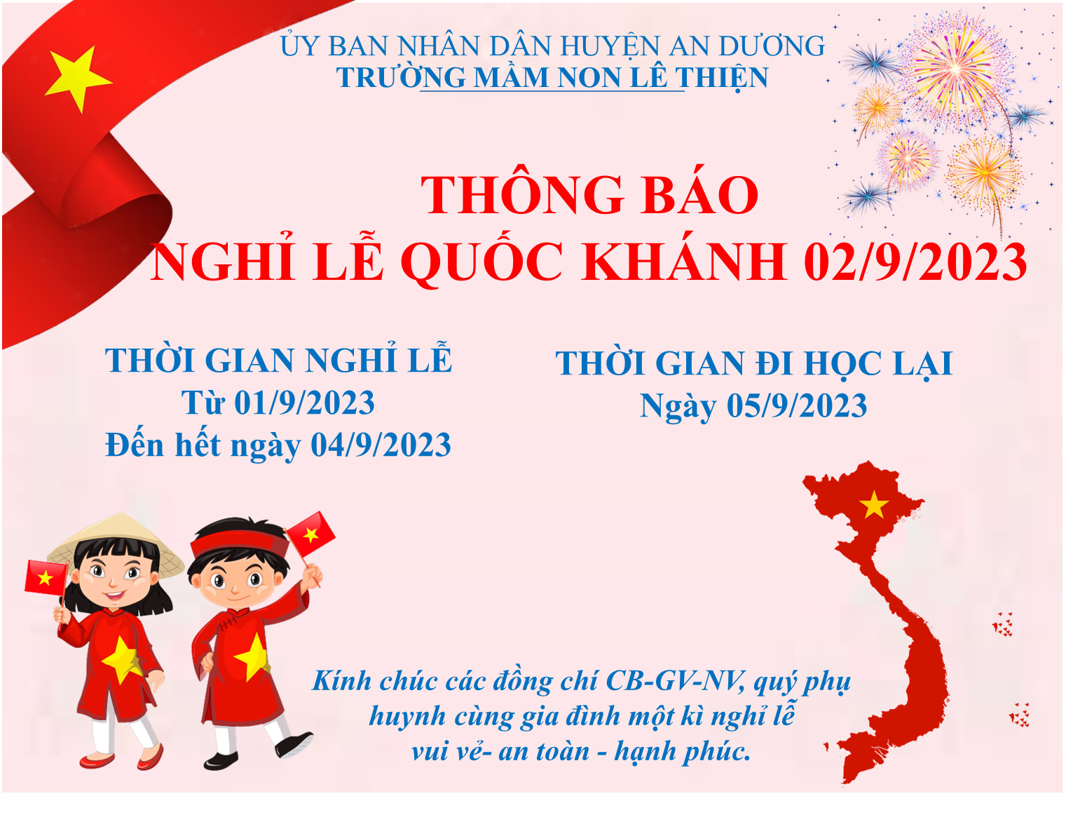 Nhân dịp nghỉ lễ Quốc khánh năm 2023, trường mầm non Lê Thiện kính chúc Quý phụ huynh, các em học sinh cùng tập thể cán bộ giáo viên, nhân viên nhà trường những ngày nghỉ lễ thật vui tươi, hạnh phúc.