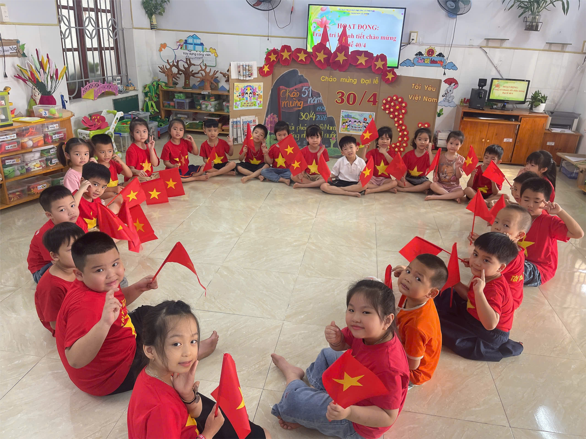* Hòa chung không khí tưng bừng chào mừng ngày 30/4, các bé 5 tuổi hào hứng tham gia hoạt động trang trí khánh tiết tại lớp. Dưới sự hướng dẫn của cô giáo, các bé cùng nhau treo cờ đỏ sao vàng, dán băng rôn và trang trí góc lớp thật rực rỡ. Những đôi bàn tay nhỏ xinh khéo léo cắt, dán, tô màu tạo nên nhiều sản phẩm đẹp mắt. Các bé thích thú khi được tự tay làm những chiếc nón đỏ sao vàng, dây cờ và những bức tranh ý nghĩa về ngày giải phóng Miền Nam thống nhất đất nước.