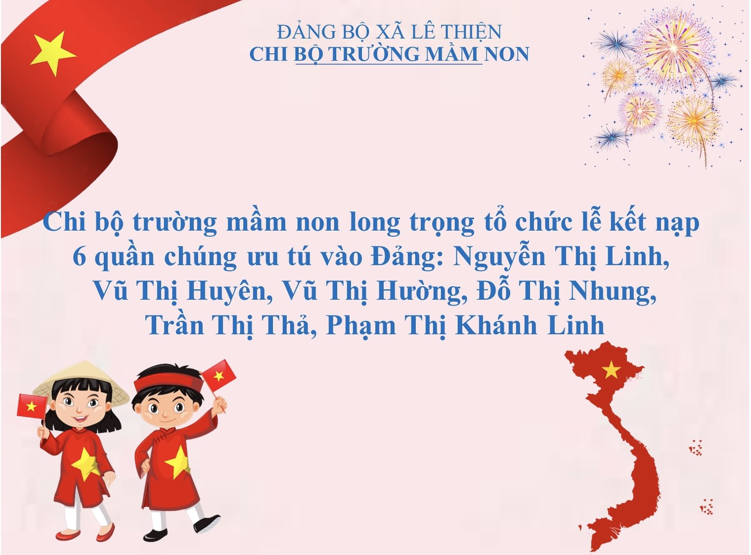 Bồi dưỡng, kết nạp Đảng viên mới là nhiệm vụ thường xuyên, có ý nghĩa quan trọng trong công tác xây dựng Đảng, góp phần phát triển nâng cao sức chiến đấu của tổ chức cơ sở Đảng nói chung và cá nhân Đảng viên nói riêng. Với ý nghĩa đó, được sự giúp đỡ của chi bộ trường mầm non cùng với sự nỗ lực phấn đấu của bản thân quần chúng Nguyễn Thị Linh, quần chúng Vũ Thị Hường, quần chúng Vũ Thị Huyên, quần chúng Trần Thị Thả, quần chúng Đỗ Thị Nhung và quần chúng Phạm Thị Khánh Linh được kết nạp vào Đảng cộng sản Việt Nam ngày 2/9/2023