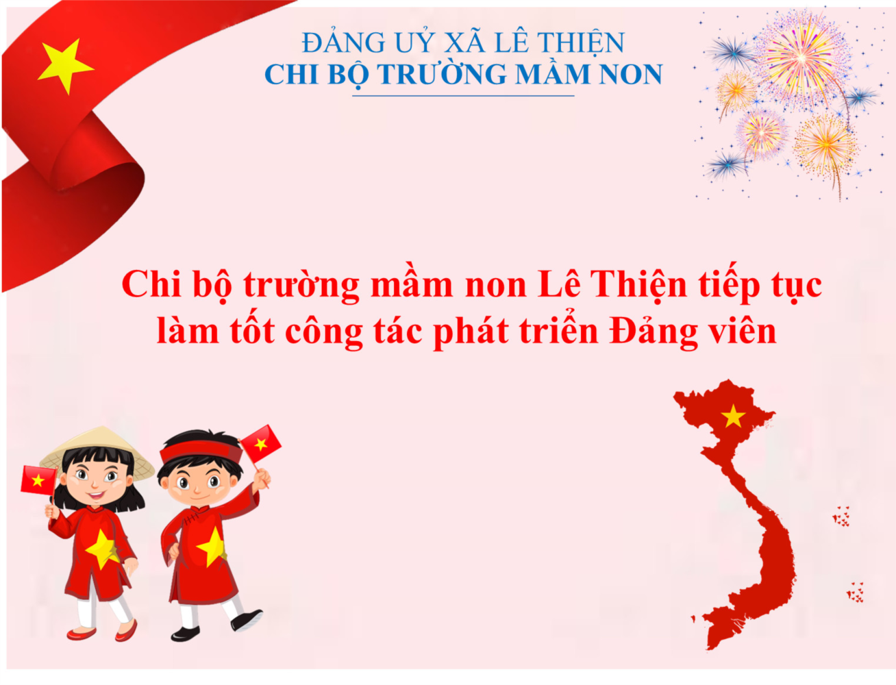 Tháng 4/2024 chi bộ trường mầm non có 6 đồng chí đảng viên mới tham gia lớp bồi dưỡng đảng viên mới tại Trung tâm chính trị Huyện An Dương. Kết thúc khoá học cả 6 đồng chí đều được cấp giấy chứng nhận hoàn thành lớp bồi dưỡng đảng viên mới. Chúc các đồng chí tiếp tục phấn đấu rèn luyện khẳng định vai trò tiên phong, gương mẫu của người đảng viên, chủ động xây dựng kế hoạch phấn đấu trở thành đảng viên chính thức, xứng đáng danh hiệu Đảng viên Đảng Cộng sản Việt Nam. Hoàn thành xuất sắc mọi nhiệm vụ được giao tại trường.