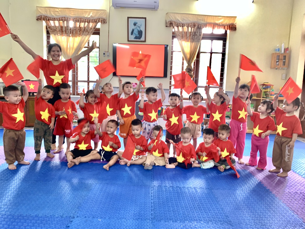 Hoà chung không khí tưng bừng của toàn Đảng, toàn quân, toàn dân chào mừng kỷ niệm 50 năm ngày giải phóng Miền Nam, thống nhất đất nước (30/4/1975 - 30/4/2025). Sáng ngày 26/4/2025, cô và trẻ lớp NT2 trường mầm non Lê Thiện đã tổ chức hoạt động “Bé vui mừng ngày thống nhất đất nước 30/4” nhằm giúp trẻ hiểu được ý nghĩa ngày Giải phóng miền Nam thống nhất đất nước 30/4 và giáo dục trẻ lòng yêu quê hương đất nước, lòng tự hào dân tộc.