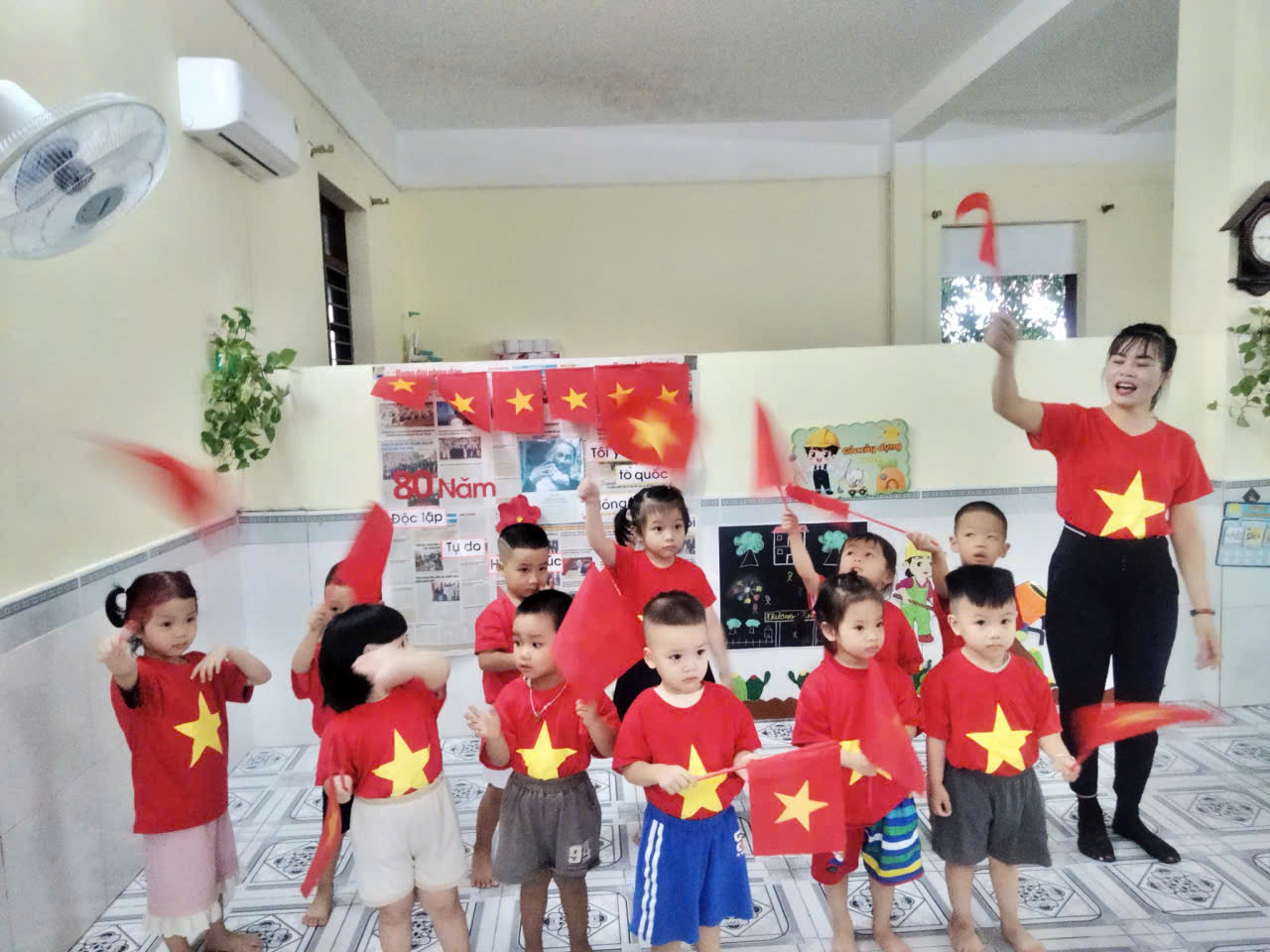 Những nụ cười rạng rỡ, ánh mắt hồn nhiên và sự đáng yêu của các bé đã làm bừng sáng không gian lớp học, để lại những khoảnh khắc đầy ý nghĩa. Hoạt động này không chỉ mang đến cho các bé kỷ niệm đẹp tuổi thơ, mà còn góp phần nuôi dưỡng trong tâm hồn các bé tình yêu quê hương, đất nước ngay từ những năm tháng đầu đời.