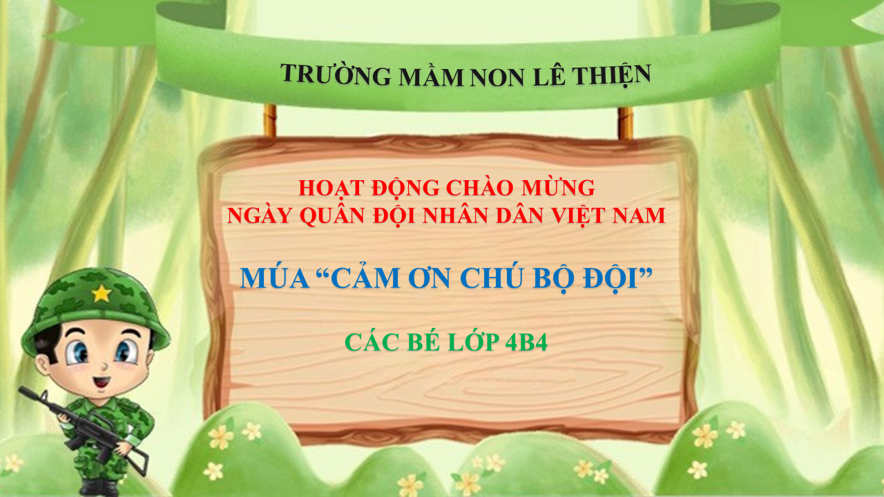Nhân dịp kỷ niệm Ngày thành lập Quân đội Nhân dân Việt Nam 22/12, các bé lớp 4B4 – Trường Mầm non Lê Thiện, khu Phí Xá đã tham gia biểu diễn tiết mục múa “Cảm ơn chú bộ đội” với tinh thần vui tươi, hào hứng và đầy ý nghĩa.