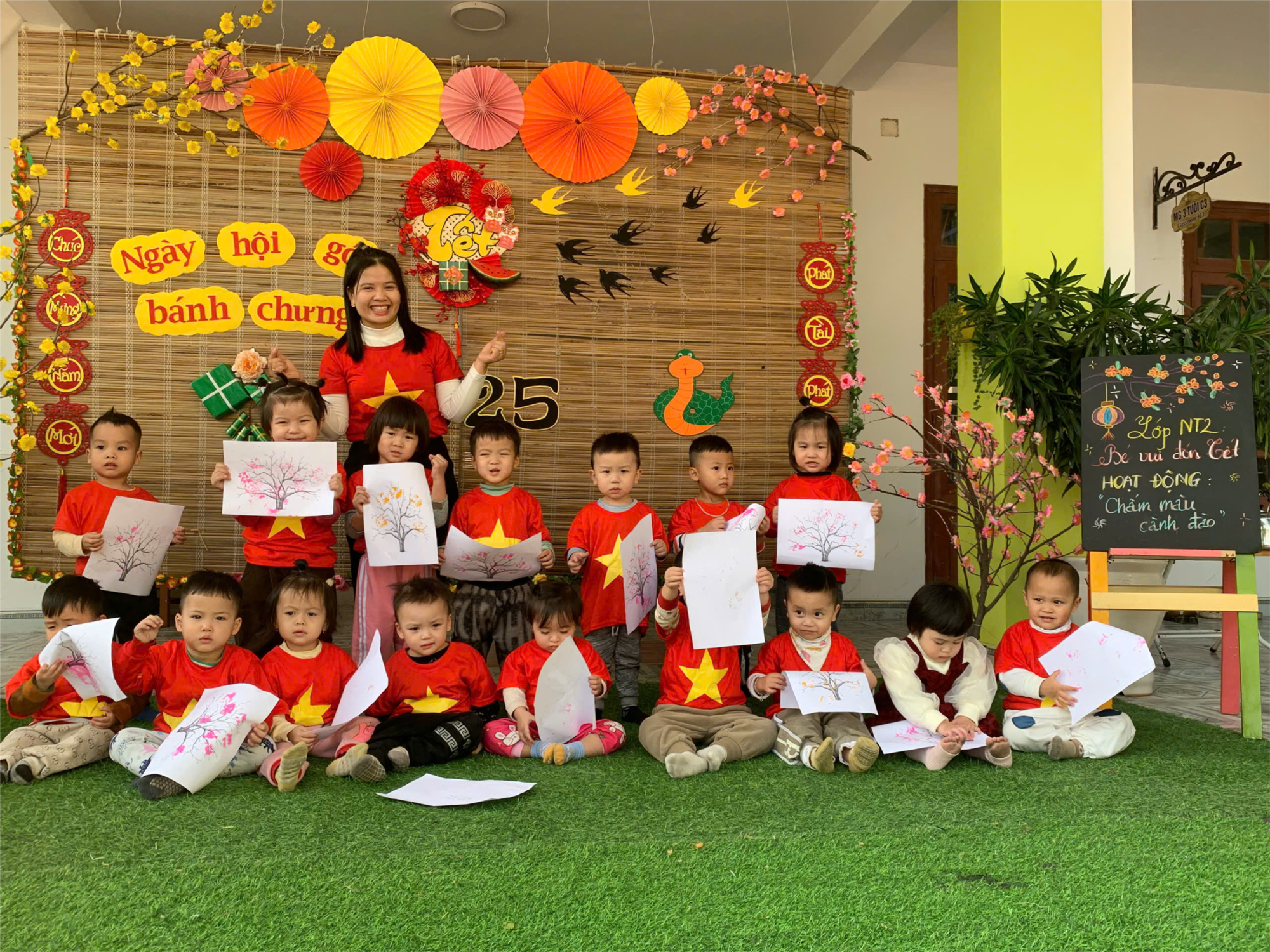 Để hưởng ứng không khí ngày tết, cô trò lớp NT2 - Trường mầm non Lê Thiện đã chấm cành đào. Sự hăng say chú ý và đôi bàn tay khéo léo của bé đã làm làm nên tác phẩm cành cành đào xuân rất đẹp.