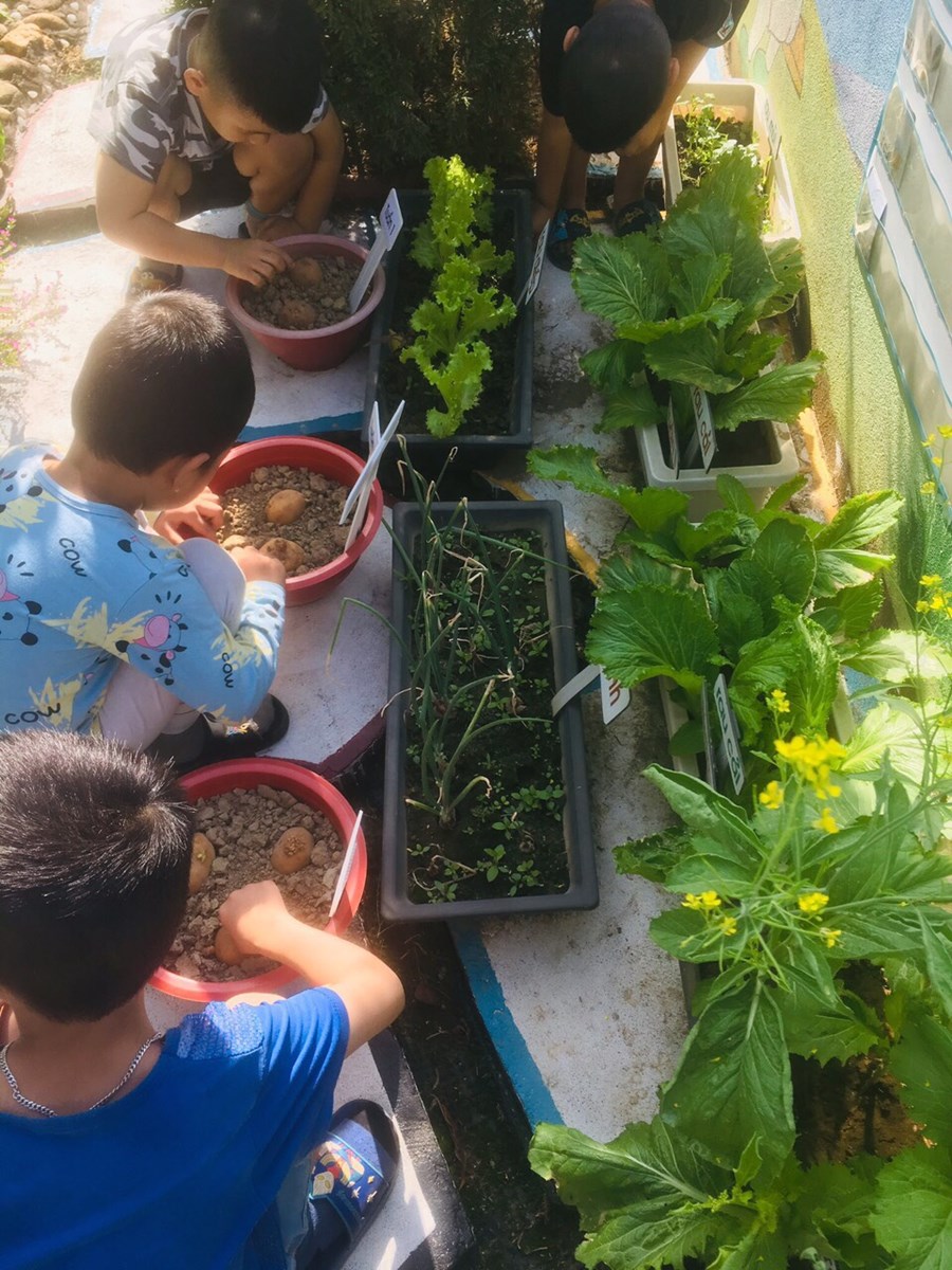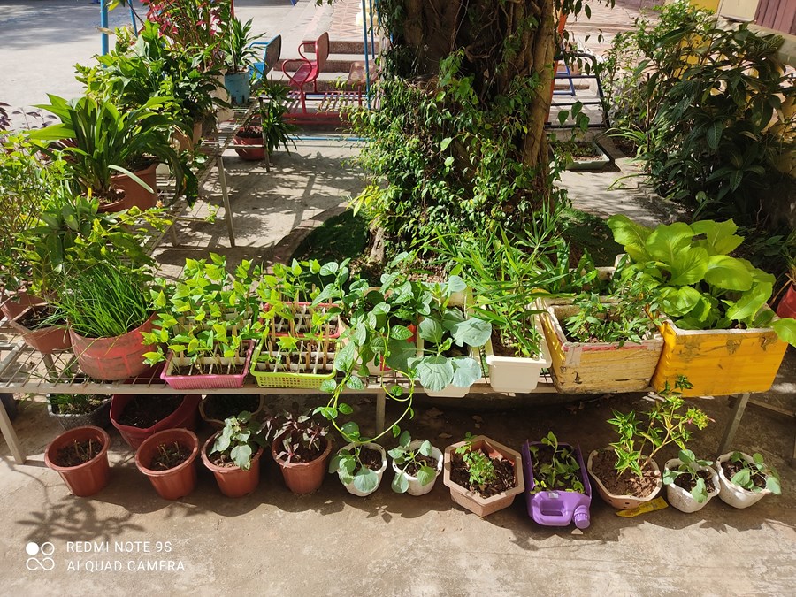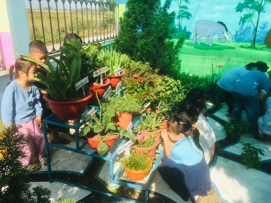 Giáo viên các lớp đã tự xây dựng môi trường xanh - an toàn- thân thiện cho lớp mình bằng các việc làm thiết thực hàng ngày như tổ chức cho trẻ được quan sát sự lớn lên của các chậu hoa cây cảnh ở góc thiên nhiên của lớp, tổ chức cho trẻ chăm sóc cây, vườn rau, hướng dẫn trẻ cách tưới nước cho rau,cây; trò chuyện về tác dụng của cây đối với đời sống con người.