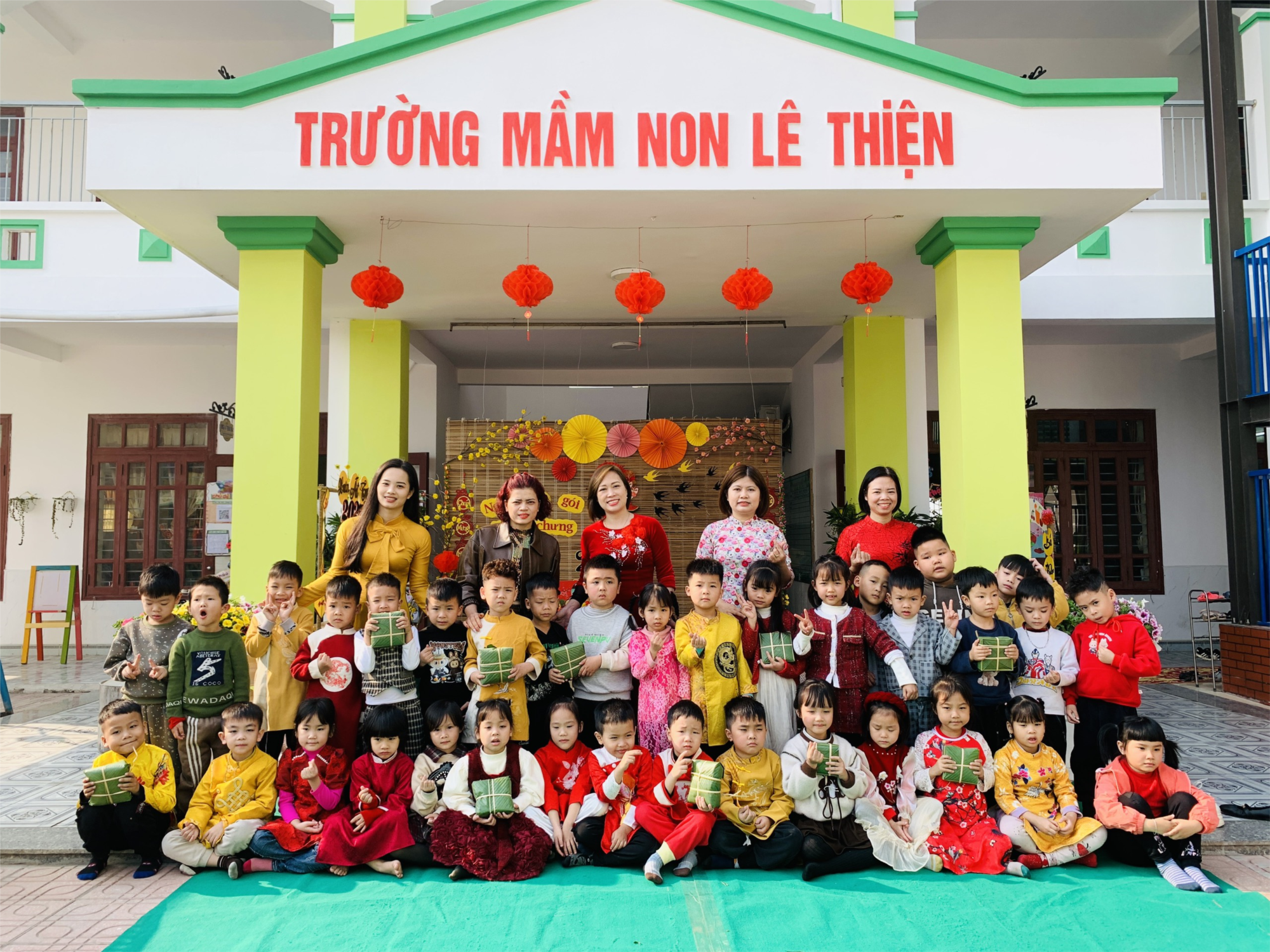 Các em rất thích thú và hào hứng khi được tự tay làm một chiếc bánh chưng xanh. Một số bạn rất khéo tay tạo ra những sản phẩm đầu tay của mình. Qua đó các em sẽ hiểu thêm về ý nghĩa của những chiếc “Bánh chưng” và ý nghĩa về tình yêu dân tộc, sự gắn kết giữa con người với con người trong ngày Tết cổ truyền dân tộc. Đây cũng là món quà trải nghiệm thật ý nghĩa mà các cô dành tặng các con trước khi đón Tết . Dưới đây là một số hình ảnh của các con ngày hội gói bánh chưng.