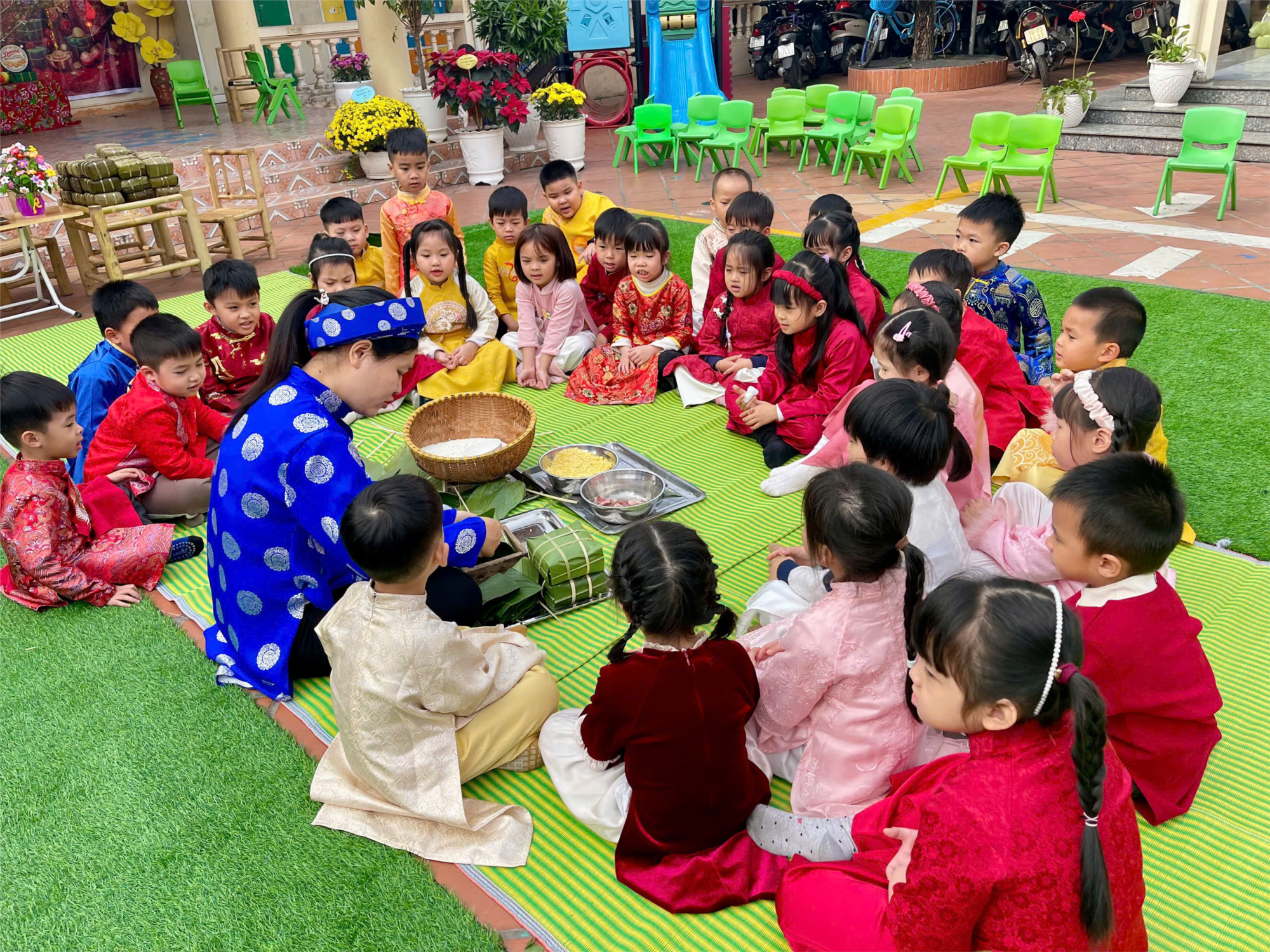 *** Trong ngày hội gói bánh chưng, các bé được trải nghiệm cùng cô trong không khí vui tươi và ấm áp. Cô nhẹ nhàng hướng dẫn từng bước, từ cách rửa lá dong đến xếp gạo, đỗ và thịt vào khuôn. Những đôi tay nhỏ xíu chăm chú làm theo lời cô, ánh mắt tràn đầy háo hức. Có bé còn thì thầm hỏi cô thật nhiều điều về chiếc bánh ngày Tết. Cô ân cần sửa từng nếp gấp, buộc từng sợi lạt cho các con. Tiếng cười rộn ràng vang lên khi chiếc bánh đầu tiên được hoàn thành.