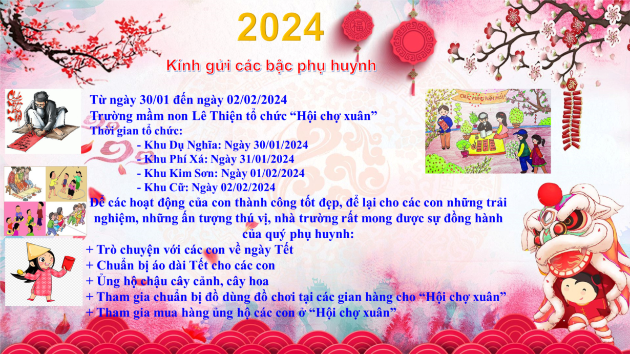 Kính mong quý phụ huynh cùng chuẩn bị cho các con những bộ trang phục thật đẹp và thu xếp thời gian, công việc tham gia trải nghiệm tại “Hội Chợ Xuân” cùng các con, để các con có được những khoảnh khắc tuyệt vời bên cô giáo và các bạn.