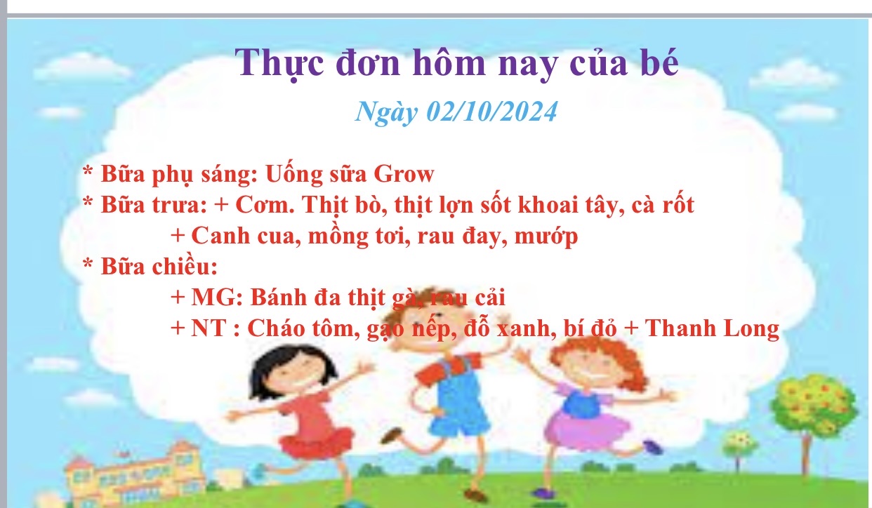 Thực đơn hôm nay của bé - Ngày 02/10/2024