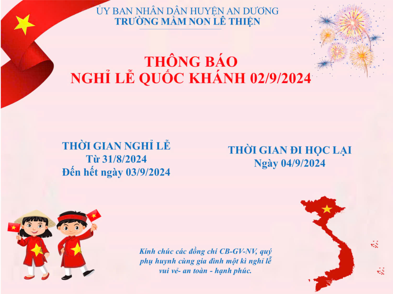 Nhân dịp nghỉ lễ Quốc khánh năm 2024, trường mầm non Lê Thiện kính chúc Quý phụ huynh, các em học sinh cùng tập thể cán bộ giáo viên, nhân viên nhà trường những ngày nghỉ lễ thật vui tươi, hạnh phúc.