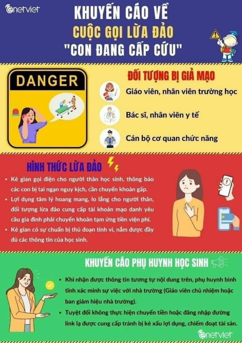Trong thời gian vừa qua nhiều phụ huynh trên khắp các tỉnh thành đã liên tiếp nhận được các cuộc gọi thông báo con em họ đang bị cấp cứu tại bệnh viện và đề nghị chuyển ngay tiền để phẫu thuật. Những đối tượng xấu đã tác động vào lòng tin và tình cảm gia đình đang lo lắng hoang mang mà lên kế hoạch lừa đảo. Trước tình trạng trên phía công an và các chuyên gia khuyến cáo cha mẹ bình tĩnh, tỉnh táo không bị mắc lừa.