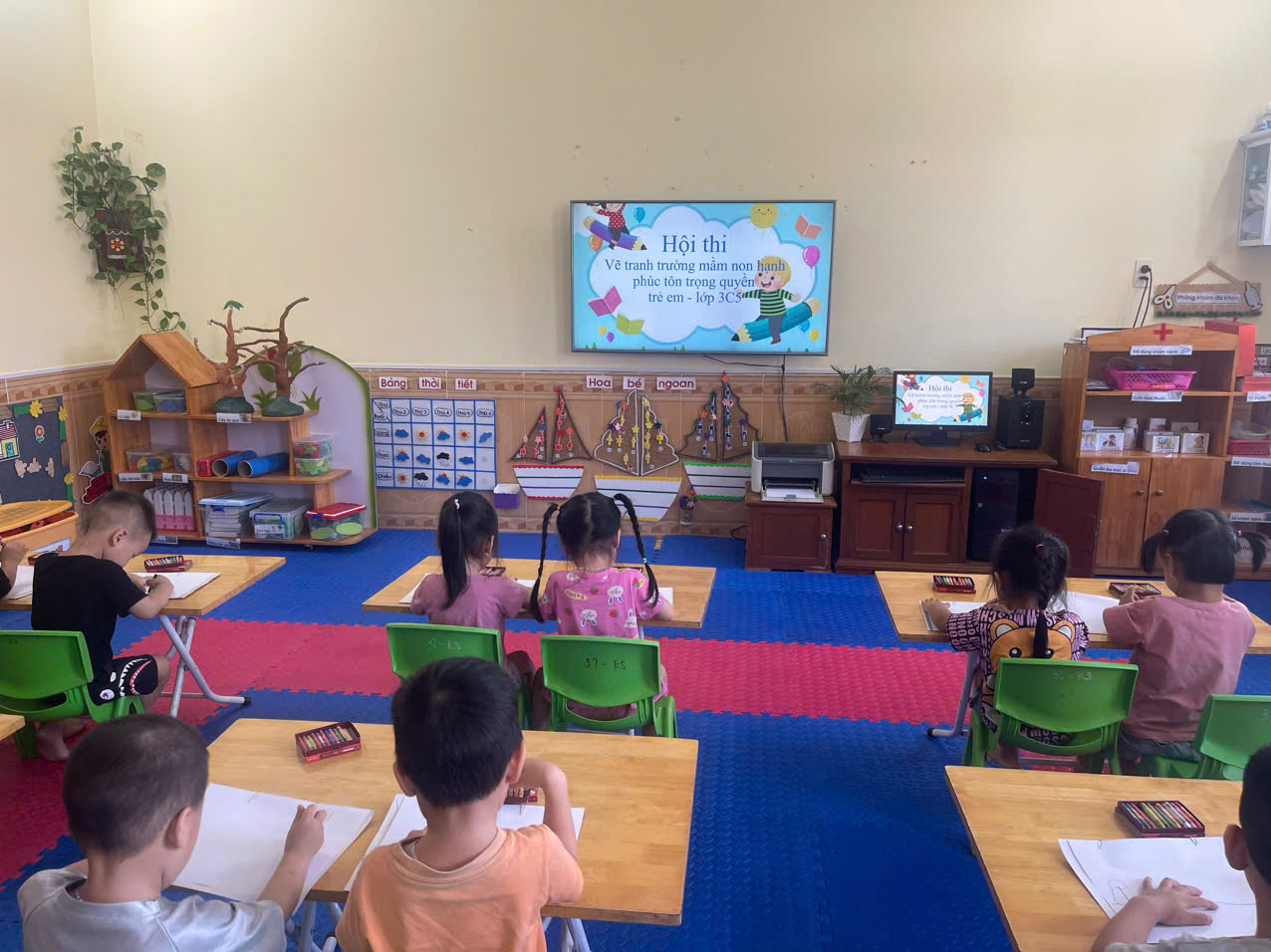 Sau đây là một số hình ảnh các bé 3C5 tham gia “Hội thi vẽ tranh” với chủ đề “Trường mầm non hạnh phúc - Tôn trọng quyền trẻ em”