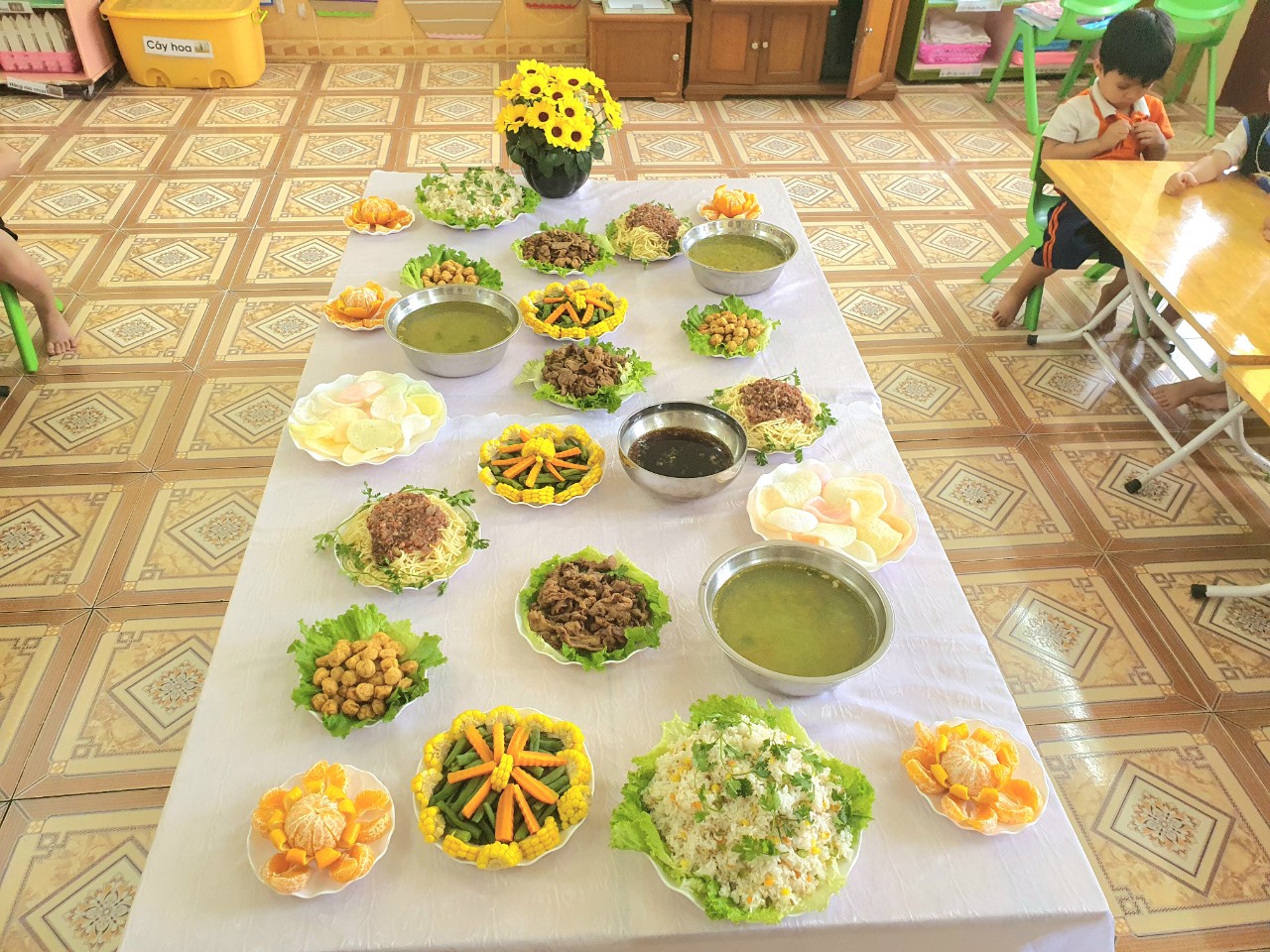 Trẻ cùng cô và các bạn trong lớp cùng nhau chuẩn bị bày bàn tiệc buffet.