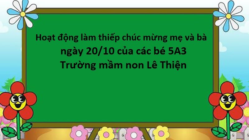 Mỗi con trẻ trên cuộc đời này đều có mẹ và bà. Mẹ và bà là những người phụ nữ gần gũi, sát cánh bên trẻ trong mỗi bước cuộc đời, người luôn tự tay chăm sóc, nuôi dưỡng trẻ. Ngay từ khi mới lọt lòng trong vòng tay ẵm bồng của bà và mẹ. Trẻ lớn lên từ dòng sữa mẹ, từ những tiếng ru ời của mẹ và bà . Tình thương của bà và mẹ vô bờ bến. Hoạt động "làm thiếp chúc mừng mẹ và bà ngày 20/10" của cô và trò 5A3 với mong muốn giúp trẻ hiểu được ý nghĩa của ngày 20/10 là ngày phụ nữ Việt Nam, ngày của các bà, các mẹ. Tạo cơ hội cho trẻ thể hiện tình cảm của mình dành cho mẹ và bà từ món quà do trẻ tự tay làm. Phát triển ở trẻ tính nhân văn, biết tỏ lòng biết ơn với người thân vào các dịp ngày lễ. Và thông qua hoạt động trẻ rèn được sự tự tin, khéo léo, tỉ mỉ, biết làm việc tập thể. Phát triển kỹ năng sáng tạo, kỹ năng tạo hình và tính thẩm mĩ cho trẻ!