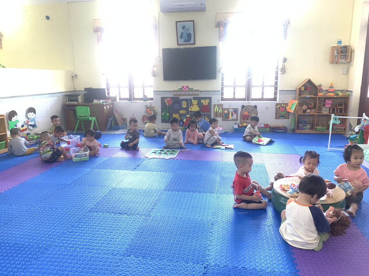 Với độ tuổi 24- 36 tháng, trẻ tham gia vào 4 góc chơi ở lớp như: Góc thao tác vai (trẻ bắt chước giả bộ các trò chơi: Nấu ăn, bế em,cho em ăn, ru em ngủ…).Góc chơi động (trẻ chơi kéo xe, thả bóng-bi, câu cá, tung bóng…).Góc chơi tĩnh ( trẻ chơi lồng hộp, tìm bóng, phân biệt màu,…). Góc nghệ thuật ( Xem tranh ảnh, kể chuyện bằng rối, tô màu, nặn…). Ở mỗi góc chơi trẻ được học những kiến thức, kỹ năng khác nhau và quan trọng hơn cả là trẻ có cơ hội được thể hiện mình và biết phối hợp cùng bạn khi tham gia các hoạt động.